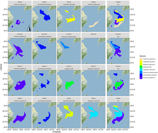 Due to certain uncertainties, the hydrological data for waters south of the 28-degree latitude during the spring and autumn seasons were not obtained from direct measurements; instead, they were substituted with data generated from environmental models [20]. These waters comprise a relatively small portion of the total survey area, accounting for less than one-sixth [42], thereby having a minimal impact on the overall trends observed. Moreover, these southern waters do not constitute the primary distribution area for fishery resources in the East China Sea and, therefore, do not significantly influence the overall distribution pattern of key fishery resources in the region. According to the optimal habitat analysis in this study, aside from hairtail and Japanese jack mackerel, which partially overlap with the most suitable waters in this area, the optimal ranges for other fish species do not intersect with this region. In summary, while the environmental data for waters south of the 28-degree latitude during spring and autumn are modeled rather than directly measured, this does not affect the primary findings and conclusions of the study. Although modeled data might be perceived as less reliable, advancements in environmental data modeling technology are improving the accuracy of predicted environmental data, leading to its broader application [43]. The inclusion of modeled data enhances the comprehensiveness of this study without significantly altering the primary findings and conclusions.