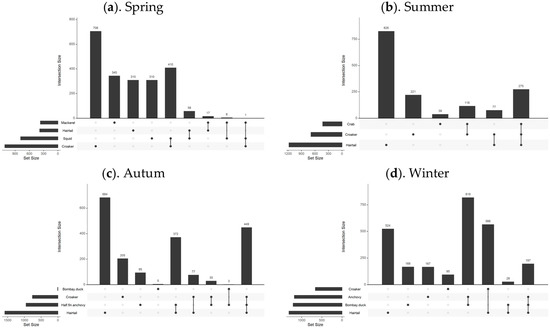 To examine the relationship between the distribution of suitable habitats for dominant fish species across seasons, this study extracted habitats with SI values greater than 0.7 for comparison and overlay, as shown in Figure 6. Upset diagrams were used to illustrate the spatial distribution relationships of different fish species, with the analysis results shown in Figure 7.