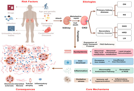 Dyslipidemia in CKD disrupts renal energy metabolism, damages cellular membranes, and induces mitochondrial and endoplasmic reticulum stress. These effects lead to lipid peroxidation, triggering ferroptosis, which contributes to renal dysfunction and fibrosis. Moreover, ferroptosis has also been identified as a critical link between lipid metabolism disorders and CKD development.