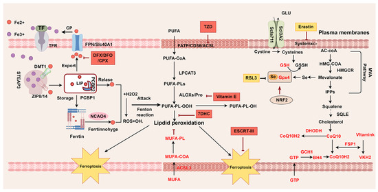 Iron overload initiates ferroptosis by driving redox reactions under pathological conditions. Even subtle changes in intracellular iron levels can affect iron homeostasis. Transferrin (TF) captures extracellular iron and binds to transferrin receptors (TFRs) to deliver transferrin-bound iron (TBI) into cells [11,12]. TFR1 serves as a biomarker that distinguishes ferroptosis from other forms of cell death [13]. When the endosomal pH decreases to 5.5–6.5, Fe3+-TF is converted to Fe2+ by six-transmembrane epithelial antigen of prostate 3 (STEAP3) and transported to the cytoplasm via metal-ion transporter-1 (DMT1/SLC11A2) or ZRT/IRT-like protein (ZIP) 8 or 14, forming a labile iron pool (LIP). Chaperones like Poly (rC)-binding protein (PCBP) regulate Fe2+ in the LIP and bind glutathione with low affinity to maintain iron homeostasis [14,15,16]. Excess iron is stored in ferritin, which consists of two subunits, FTH (which oxidizes Fe2+ to Fe3+) and FTL (which aids in iron mineralization and core formation) [3]. Nuclear coactivator 4 (NCOA4) selectively mediates ferritinophagy in the lysosome, releasing Fe2+ and triggering ferroptosis [17,18,19,20]. The only cellular iron export pathway is regulated by hepcidin through Ferroportin (FPN/SLC40A1) [21,22]. Hepcidin, a hormone synthesized by the liver, binds to and degrades Ferroportin (FPN), reducing intracellular iron efflux [23,24]. The exported Fe2+ is then oxidized to Fe3+ by ceruloplasmin (CP), allowing it to re-enter the intracellular iron cycle.