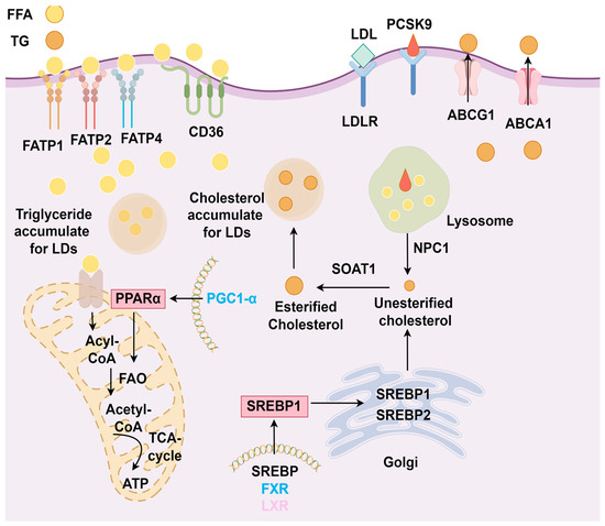 Dysregulation of cholesterol metabolism is one of the hallmarks of CKD. Early studies showed that a high-cholesterol diet caused lipid deposition in rabbit kidneys [95]. Prospective cohort studies have also shown that familial hypercholesterolemia is linked to a heightened risk of CKD [96], highlighting cholesterol toxicity as a significant factor in CKD progression [97]. In CKD patients, increased SREBP expression accelerates cholesterol synthesis, leading to increased sterol O-acyltransferase 1 (SOAT1) activity and reduced neutral cholesterol ester hydrolase (NCEH) activity. Additionally, the nuclear translocation of ABCA1 and ABCG1 is inhibited, reducing their activity and preventing the elimination of excess cholesterol, causing cholesterol to accumulate in lipid droplets (LDs) [98,99].
