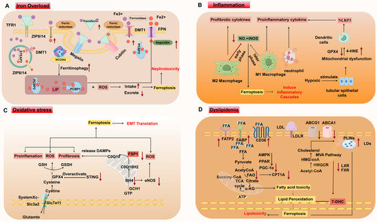 Mechanisms of ferroptosis in CKD. (A) Iron overload. (B) Inflammation. (C) Oxidative Stress. (D) Dyslipidemia. LDL low-density lipoproteins; LDLR LDL receptor; ABCG1 ATP-binding cassette subfamily G member 1; ABCA1 ATP-binding cassette subfamily A member 1; LXR liver X receptor; FXR farnesoid X receptor; PPAR peroxisome proliferator-activated receptor; PGC-1α peroxisome proliferator-activated receptor-gamma coactivator 1α; AMPK; AMP-activated protein kinase; SREBP sterol regulatory binding proteins; PLINS perilipins; LD lipid droplets; FFA free fatty acids; FAO fatty acid oxidation; CPTA1 carnitine palmitoyltransferase 1A; HMGCR 3-hydroxy-3-methylglutaryl-CoA reductase; 7-DHC 7-dehydrocholesterol; STING stimulator of interferon genes; DAMPs damage-associated molecular patterns; TECs tubular epithelial cells. This picture is drawn in Figure 2.