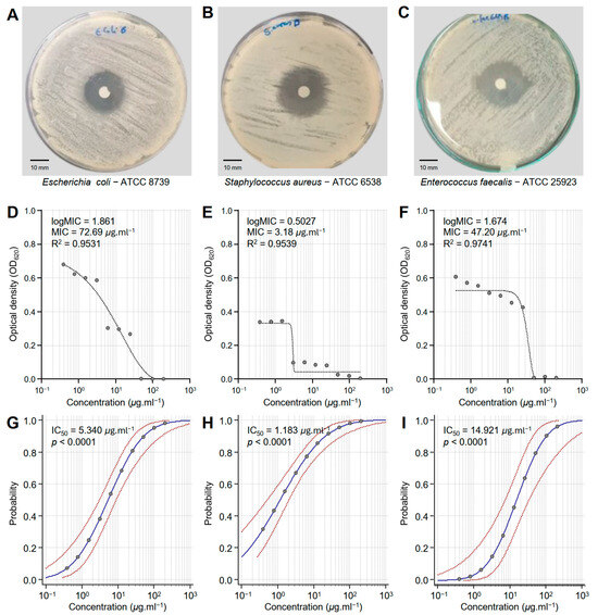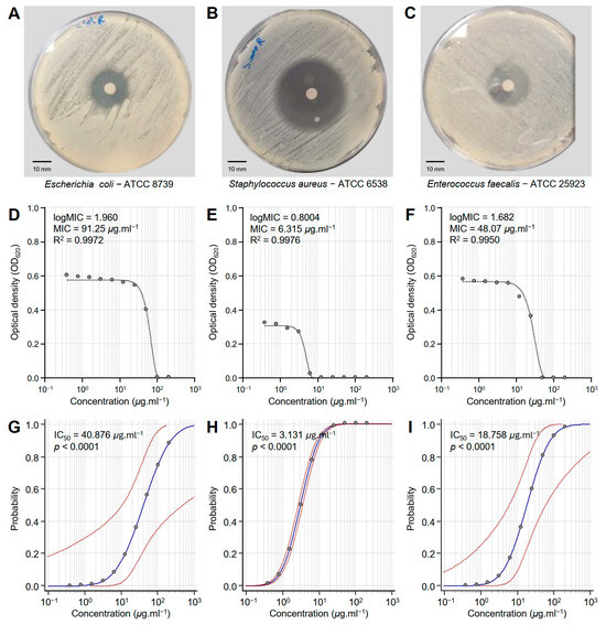 In vitro antibacterial activity of honeybee venom (BV) extracts against three multidrug-resistant human pathogenic bacteria. (A–C) Disc diffusion method of the BV extract (200 μg·mL−1) against Escherichia coli—ATCC 8739, Staphylococcus aureus—ATCC 6538, and Enterococcus faecalis—ATCC 25923, respectively. (D–F) Susceptibility analysis and minimum inhibitory concentrations (MICs) of BV extract against E. coli, S. aureus, and E. faecalis, respectively. Different concentrations of the BV extract were prepared in DMSO (200, 100, 50, 25, 12.5, 6.25, 3.125, 1.562, 0.781, and 0.390 μg·mL−1). (G–I) Probit regression (dose–response analysis) of BV extract against E. coli, S. aureus, and E. faecalis, respectively. Gray dots present the means of three replicates of each concentration. Blue solid lines represent the probit regression lines, whereas red dashed lines edge represent the 95% confidence intervals for the estimated regression. Probit-associated half-maximal inhibitory concentrations (IC50; μg·L−1), 95% confidence intervals, and overall model fit are listed in Table 1. For BV extract, the IC50 against E. coli ATCC8739 was 5.340 μg·mL−1 (95% CI: 3.080–8.929 μg·mL−1), against S. aureus ATCC 6538 it was 1.183 μg·mL−1 (95% CI: 0.524–2.069 μg·mL−1), and against E. faecalis ATCC 25923 it was 14.921 μg·mL−1 (95% CI: 7.181–32.692 μg·mL−1).