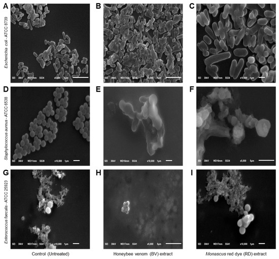 Effects of honeybee venom (BV) and Monascus red dye (RD) extracts on cellular morphology of three multidrug-resistant human pathogenic bacteria. (A–C) Scanning electron microscopy (SEM) micrographs illustrating the cytomorphology of E. coli before the treatment (control), after treatment with the BV extract, and after treatment with the RD extract, respectively. (D–F) SEM-based micrographs of S. aureus before the treatment (control), after treatment with the BV extract, and after treatment with the RD extract, respectively. (G–I) SEM-based micrographs of E. faecalis before the treatment (control), after treatment with the BV extract, and after treatment with the RD extract, respectively. The micrographs are presented at varying magnification levels, denoted by the scale bars. Images (A,B,F,H) were acquired at 5000× magnification, while micrographs (C–E,G,I) were captured at higher magnification (10,000×).