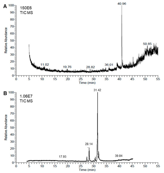 Chemical analyses of honeybee venom (BV) and Monascus red dye (RD) extracts using gas chromatography–mass spectrometry (GC–MS) running in the full-scan mode. (A,B) Representative chromatograms of BV dimethyl sulfoxide (DMSO)-based extract and RD extract, respectively.