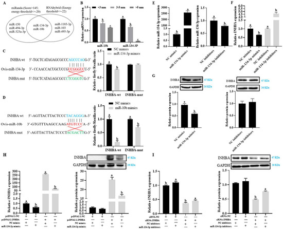miR-134-3p targets INHBA regulation. (A) miR-134 indicates that p and miR-10b are anticipated to target INHBA, according to RNAhybrid and miRanda. (B) GC levels of predicted miRNAs (miR-134-3p and miR-10b) in follicles <3, 3–5, and >5 mm. qPCR analysis was used to identify the miRNA expression data, which were then normalized to miR-16b. (C,D) Diagrams showing how miR-134-3p and miR-10b interact with both mutant (mut) and wild-type (wt) INHBA (blue and green, respectively). Red nucleotides indicate the miR-134-3p and miR-10b seed sequences. Co-transfection of reporter vectors for wt or mut miR-134-3p-INHBA interaction site and miR-10b or NC mimics in 293T cells (right) and luciferase assays. (E) Levels of miR-134-3p with transfection of NC mimics, miR-134-3p mimics, NC inhibitors, or miR-134-3p inhibitors. (F,G) Relative INHBA expression following transfection with NC mimics, miR-134-3p mimics, NC inhibitors, or miR-134-3p inhibitors, respectively. (H) INHBA mRNA and protein levels with vector-null and NC mimics, vector-null and miR-134-3p mimics, INHBA overexpression and NC mimics, INHBA overexpression and miR-134-3p mimics co-transfection. (I) INHBA mRNA and protein levels with siRNA-NC and NC mimics, siRNA-NC and miR-134-3p mimics, INHBA suppression and NC mimics, INHBA suppression and miR-134-3p inhibitors co-transfection. Data are given as mean ± SEM. Distinct letters (a, b, and c) denote significant differences (p < 0.05).
