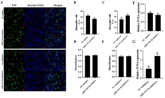 miR-134-3p blocks proliferation in sheep GCs. Analysis of cell proliferation was conducted through EdU (A–C) and CCK-8 (D,E) assays (scale bar = 50 µm). (F,G) PCNA mRNA levels. The mean ± standard error of the mean (S.E.M.) is used for data presentation. Data are given as mean ± SEM. Distinct letters (a, b) denote significant differences (p < 0.05).