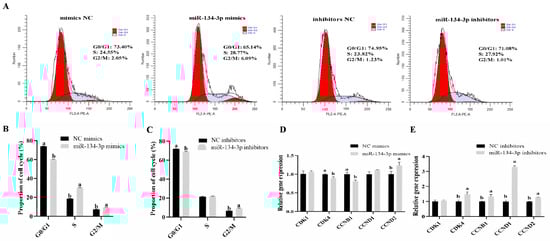 Influence of miR-134-3p on the GC cell cycle. (A–C) Impact of miR-134-3p on the cell cycle in GCs following transfection with miR-134-3p mimics or inhibitors. (D,E) Levels of cell cycle-associated genes following transfection. Data are given as mean ± SEM. Distinct letters (a, b) denote significant differences (p < 0.05).