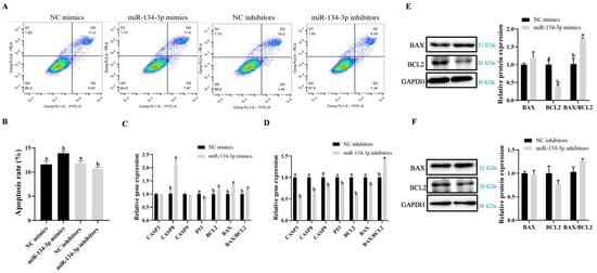 GC apoptosis is promoted by miR-134-3p. (A,B) The percentage of apoptosis (total apoptosis = late and early apoptosis) in GCs with overexpression and silencing of miR-134-3p is displayed by flow cytometry. (C,D) miR-134-3p overexpression and inhibition in the mRNA expression of genes associated with apoptosis. (E,F) Expression of the proteins BAX and BCL2. Data are given as mean ± SEM. Distinct letters (a, b) denote significant differences (p < 0.05).