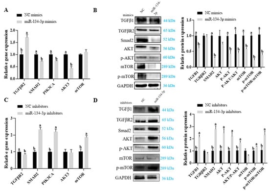 miR-134-3p suppresses the TGF-β/PI3K/AKT axis. mRNA levels of PI3K/AKT-related components after miR-134-3p mimic (A) and miR-134-3p inhibitor (C) exposure. Levels of PI3K/AKT-related proteins following miR-134-3p mimic (B) and miR-134-3p inhibitor (D) exposure. Data are given as mean ± SEM. Distinct letters (a, b) denote significant differences (p < 0.05).