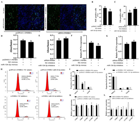 miR-134-3p regulates GC proliferation by targeting INHBA. INHBA suppression and miR-134-3p inhibition, as well as the combination of INHBA and miR-134-3p overexpression, all affect GC proliferation. Analysis of cell proliferation using CCK-8 (D,E) and EdU incorporation assays (A–C) (corresponding scale bars = 50 µm) (F,G) PCNA mRNA levels. (H–J) Effects of INHBA and miR-134-3p overexpression, INHBA suppression and miR-134-3p inhibition on the GC cell cycle. (K,L) Levels of cell cycle-related gene GCs overexpressing INHBA and miR-134-3p, INHBA suppression and miR-134-3p inhibition. Data are given as mean ± SEM. Distinct letters (a, b) denote significant differences (p < 0.05).