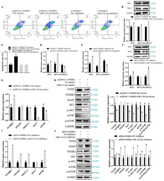 miR-134-3p modulates apoptosis in GCs and influences the TGF-β/PI3K/AKT axis via INHBA. Flow cytometry illustrating the effect of INHBA overexpression and miR-134-3p mimics co-transfection, INHBA silencing and miR-134-3p co-transfection on GC apoptosis. (A,C) The apoptosis percentage in GCs is displayed by flow cytometry (total apoptosis = late and early apoptosis). (D,E) INHBA overexpression and miR-134-3p mimics co-transfection, INHBA silencing and miR-134-3p co-transfection, and apoptosis-related mRNA levels (B,F) Levels of BAX and Bcl2 proteins. mRNA levels of PI3K/AKT axis-related genes with pcDNA3.1-INHBA and miR-134-3p mimics co-transfection (G), and siRNA-INHBA and miR-134-3p inhibitors co-transfection (I) treatment. Protein expression of PI3K/AKT pathway-related protein with pcDNA3.1-INHBA and miR-134-3p mimics co-transfection (H), and siRNA-INHBA and miR-134-3p inhibitors co-transfection (J) treatment. Data are given as mean ± SEM. Distinct letters (a, b) denote significant differences (p < 0.05).