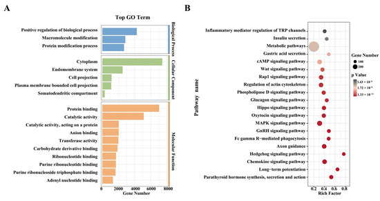 Functional enrichment analysis of candidate genes. (A) GO term enrichment for genes within the top 5% candidate region. (B) KEGG analysis of the selected genes within the candidate region.