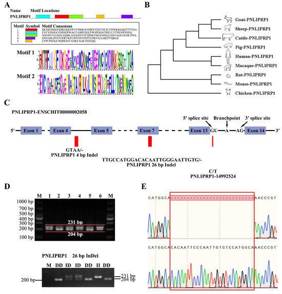 SNP and Indel analysis of the PNLIPRP1 gene in goats. (A) Schematically displaying Motif 1 and Motif 2 of the PNLIPRP1. (B) Gene evolution tree analysis of PNLIPRP1 in different species. (C) SNP and Indels were detected in PNLIPRP1, the loci of which are indicated in the schematic structure of the PNLIPRP1 gene. (D) Electrophoretic profile of amplified PNLIPRP1 26 bp Indel in 2% agarose gel. II genotype: 231 bp; ID genotype: 231 bp and 204 bp; DD genotype: 204 bp. (E) DNA sequencing maps of the 26 bp Indel in the PNLIPRP1 gene. The sequence with the red border shows the difference in sequence fragment.