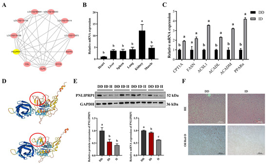 Expression pattern of PNLIPRP1 and its role in goat hepatic fat deposition. (A) Protein interaction network diagram constructed using Cytoscape software (version 3.7.2). (B) Expression of PNLIPRP1 in various tissues of 6-month-old goats. (C) Expression levels of fatty acid metabolism-related genes in different genotype populations. (D) PNLIPRP1 26 bp Indel wild-type and mutant-type protein tertiary structure prediction. (E) The effect of PNLIPRP1 26 bp Indel (II genotype or ID genotype) on the expression level of PNLIPRP1 in the liver. (F) HE and ORO staining images of liver with different genotypes; scale bars: 100 µm. Data are presented as the mean ± SEM. a–c The difference was significant when data had different letters (p < 0.05), whereas there was no significant difference when data had the same letters (p > 0.05).