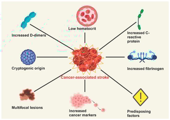 - Cen, G.; Wang, J.; Wang, X.; Song, Y.; Chen, S.; Li, J.; Huang, Q.; Liang, Z. Pathogenesis and Biomarkers of Cancer-Related Ischemic Stroke. J. Inflamm. Res. 2024, 17, 8589–8597. [Google Scholar] [CrossRef]