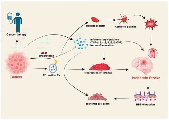 Potential mechanism of cancer-associated ischemic stroke. Cancer cells release inflammatory cytokines, TF-positive EVs, and neuroinflammatory molecules into the circulation. In addition, activated platelets induce ROS and mediate stroke. TF-positive EVs and inflammatory markers engage the progression of thrombi and ischemic stroke responsible for BBB disruption and ischemic cell death. EVs = extracellular vesicles; G-CSF = granulocyte colony-stimulating factor; BBB = blood-brain barrier; ROS = reactive oxygen species.