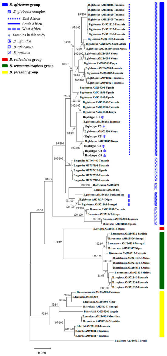 Maximum likelihood tree of the Bulinus snails constructed based on COI sequences. Nodal supports are the bootstrap values generated by neighbor joining followed by those from maximum likelihood analyses. The star represents six COI haplotypes (C1–C6) of B. globosus examined in this study (see more details in Table 1).