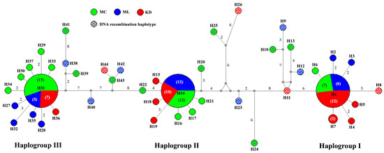 The AkInt3 haplotype network separated B. globosus into three main haplogroups, i.e., haplogroup I, II, and III. The AkInt3 sequence was subsequently defined into three fragments that corresponded to specific detection in each haplogroup. Thus, each haplotype consisted of either DNA fragment(s) found only in a particular haplogroup or combined DNA fragments between haplogroups (DNA recombination haplotype) (Table S1). For instance, haplotypes H1–H7, H14–H19, and H27–H37 contained DNA fragments only found in haplogroups I, II, and III, respectively. However, DNA recombination haplotypes were found in several haplotypes that aligned between the three main haplogroups of the haplotype network (Figure 2). For example, H8, H11, H12, H13, H23, and H24 were DNA recombinant haplotypes between haplogroup I and II, whereas H9, H10, H38, H39, and H41 were DNA recombinant haplotypes between haplogroup I and III, while H20, H22, H25, H26, H40, H42, H43, and H44 were DNA recombinant haplotypes between haplogroup II and III (Figure 2).