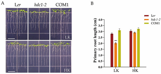 Arabidopsis thaliana L. primary root growth in hdc1-2 was inhibited under low-potassium (LK) conditions. (A) Phenotypes of the wild-type (Ler), hdc1-2 mutant (hdc1-2), and hdc1-2/ProHDC1:HDC1 complementation line (COM1). Arabidopsis seeds were germinated and grown on LK (50 μM) or HK (5 mM) media. The phenotypes were recorded on the seventh day. (B) Primary root lengths of the plants tested in (A). Data are means of three independent biological replicates ± SE; 21 seedlings per genotype under each condition were processed for each replicate. Statistical significance was determined using Student’s t-test (*** p < 0.001), Scale bar, 1 cm.