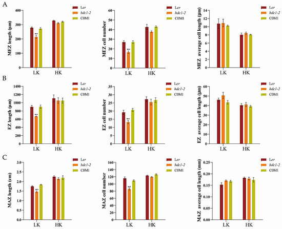 Efficient cell division and differentiation in a dynamic balance are key to maintaining continuous root growth [38,39], and root developmental plasticity relies on changes in apical meristem activity [40]. To elucidate the underlying mechanism responsible for the short primary roots of hdc1-2, we observed and measured the different zones within the primary roots, specifically the apical meristem zone (MEZ), elongation zone (EZ), and the maturation zone (MAZ). No significant differences in root growth were observed between Ler and hdc1-2 under HK conditions. However, under LK stress, all the tested zones were shorter in hdc1-2 than in Ler due to a decrease in the number of cells in the mutant root rather than cell length (Figure S2 and Figure 2). This suggests that under LK conditions, the cell division of hdc1-2 may have been impaired, which led to a decrease in the number of root cells.