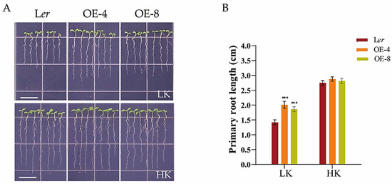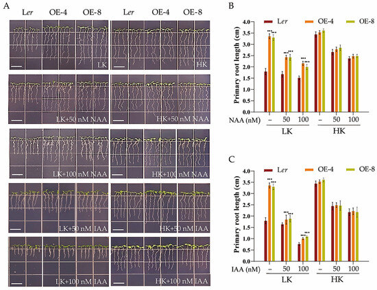 Inhibition of Arabidopsis thaliana L. primary root growth in overexpression lines by exogenous application of NAA and IAA under low-potassium (K+) stress. (A) Phenotypes of various plants. Scale bar, 1 cm. (B,C) Primary root length of the plants tested in (A). Arabidopsis seeds were germinated and grown on low-potassium (LK, 50 μM) or high-potassium (HK, 5 mM) medium with or without NAA or IAA. The phenotypes were recorded on the fifth day. Data are means of three independent biological replicates ± SE, and 21 seedlings per genotype under each condition were processed for each replicate. Statistical significance was determined using Student’s t-test (*** p < 0.001).