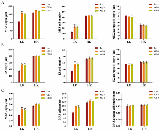 At the same time, observations and measurements were conducted on different regions of the main root of overexpressed (OE) lines. Under LK conditions, due to an increase in the number of cells in the root, all test regions of the OE-4 and OE-8 transgenic plants were longer than those of Ler, but there was no difference under HK conditions (Figure S3 and Figure 4). These results further indicated the regulation of root mitotic cell division by HDC1.