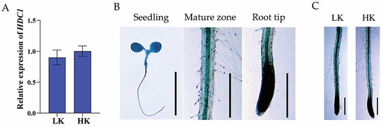 The phenotypes of impaired root growth and cell division suggest a potential role for HDC1 in root meristem responses to K+ deficiency. Consequently, we examined the transcript abundance of HDC1 in roots under LK and HK conditions. As shown in Figure 5A, the expression level of HDC1 remained unaffected by K+ deficiency compared with that in plants grown under sufficient K+. To verify and further analyze the HDC1 expression pattern and its response to K+ availability, we generated transgenic plants (ProHDC1:GUS) carrying the marker gene GUS driven by the native HDC1 promoter in the Ler ecotype. The results of GUS staining showed that HDC1 was widely expressed in the vegetative seedling stage of Arabidopsis, with GUS activity more pronounced in the root tip than in other parts of the root (Figure 5B), which is consistent with a previous study in the Col-0 ecotype [33] and a potential role of HDC1 in root meristem responses to K+ deficiency. Subsequently, randomly selected ProHDC1:GUS lines were subjected to LK or HK treatment for 7 days. The samples were then collected for staining observation. As shown in Figure 4C, strong GUS activity at the root tips could not be differentiated between the LK and HK treatments.