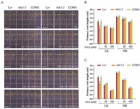 Partial restoration of Arabidopsis thaliana L. primary root growth in the hdc1-2 mutant with low-potassium (K+) inhibition by exogenous application of NAA and IAA. (A) Phenotypes of the various plants. Scale bar, 1 cm. (B,C) Primary root length of the plants tested in (A). Seeds were germinated and grown on low-potassium (LK, 50 μM) or high-potassium (HK, 5 mM) medium with or without NAA or IAA. The phenotypes were recorded on the seventh day. Data are means of three independent biological replicates ± SE, and 21 seedlings per genotype under each condition were processed for each replicate. Statistical significance was determined using Student’s t-test (*** p < 0.001).