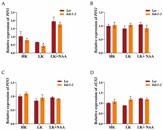 The plasticity of the plant root system is largely related to phytohormone metabolism and signaling. For example, higher CuSO4 concentrations inhibited primary root elongation in Arabidopsis seedlings by modulating auxin distribution through PIN1 but not PIN2 or AUX1 [50,51]. Previous research has indicated a link between LK perception and auxin signaling [43]. Later research showed that the AKT1-mediated LK response is primarily mediated by PIN1 proteins [52]. In the current study, we found that HDC1 positively regulates the sensitivity of root growth to auxin because the root growth of hdc1-2 was almost unchanged, and HDC1-overexpression lines still had longer primary roots than Ler after NAA treatment under LK (Figure 6 and Figure 7). HDC1 may regulate root growth both by affecting auxin transport and subsequently auxin sensitivity, since the expression of PIN1 and AUX1 was significantly altered (Figure 8).