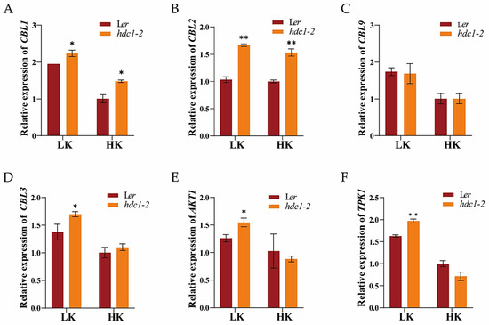 It is well established that dual CBL-CIPK pathways regulate K+ channels and transporters in response to K+ fluctuations in the environment. HDC1 has been identified as a component of HDAC complexes, and its knockout promotes histone acetylation and gene expression [34]. We examined the transcript levels of genes in “CBL-CIPK-channel” modules in response to external K+ and found that their expression was induced by LK (Figure 9), consistent with previous reports. There were no differences in the transcript levels of CBL9 between hdc1-2 and Ler, although the expression of CBL9 was induced by LK stress, similarly to other genes (Figure 9C). However, the expressions of CBL1 and CBL2 were considerably higher in hdc1-2 than in Ler under both the HK and LK conditions (Figure 9A,B). Additionally, the expressions of CBL3, AKT1, and TPK1 were significantly increased in hdc1-2 under LK stress (Figure 9D–F). These results indicate that HDC1 acts upstream of “CBL-CIPK-channel” modules under K+ deficiency.