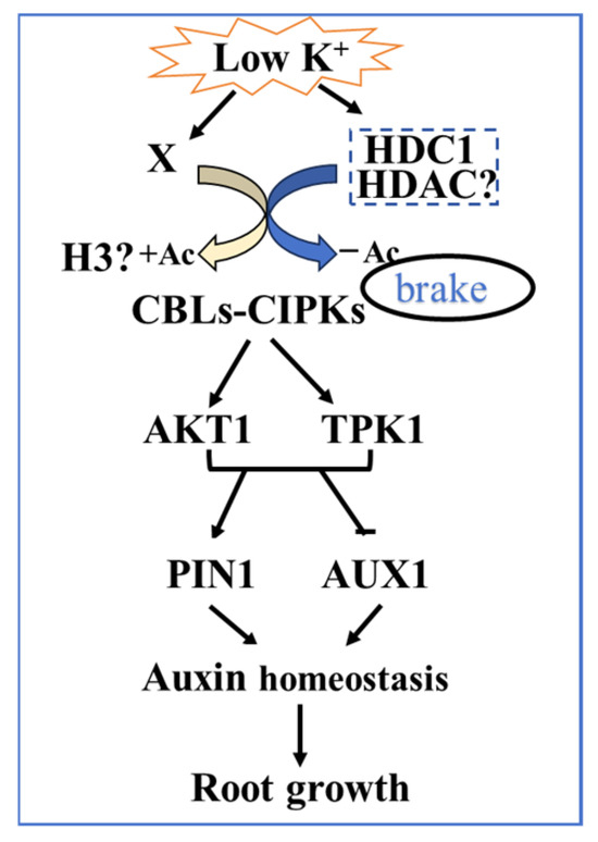 In addition to catalyzing histone deacetylation, some HDACs deacetylate non-histone proteins to regulate multiple pathways [55]. HDC1 in plants is encoded by a single copy gene and functions as a component of HDACs. Previous studies have shown that HDC1 mediates histone H3 deacetylation to inhibit LPR and ALMT1 transcription and to regulate root system development in Arabidopsis under Pi starvation [33]. The present results indicate that HDC1 regulates the auxin-dependent primary root growth and the expression of CBLs–CIPKs pathway genes. The CBLs-CIPKs pathway regulates auxin transporters and coordinates auxin-mediated root responses to abiotic stresses [56,57]. We hypothesized that HDC1 mediates histone H3 deacetylation to inhibit CBLs-CIPKs signaling pathways, thus modulating auxin transporters and regulating auxin-mediated root responses to LK stress.