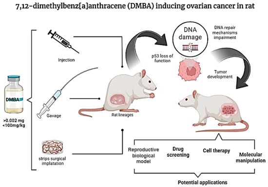Chemically induced OC in animal models highlights the processes of oncogenesis, development, invasion, and metastasis [8]. The chemical compound DMBA (7,12-dimethylbenz[a]anthracene) is widely used in animal models to induce breast carcinoma, ovarian adenocarcinomas, and skin cancer. Moreover, several studies have shown that DMBA-induced ovarian adenocarcinomas are genetically similar to human ovarian adenocarcinomas [9]. Figure 1 shows the steps and current possibilities for DMBA use in rat models.