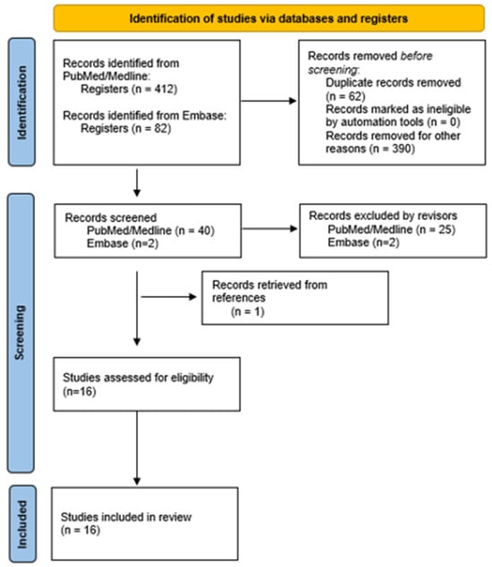 Article searches, identification, and selection were carried out as described in Figure 2. From among the 412 titles and abstracts from PubMed and the 82 articles from Embase, 42 articles were chosen following the inclusion and exclusion criteria, and they were then narrowed down to 16 for the systematic review.