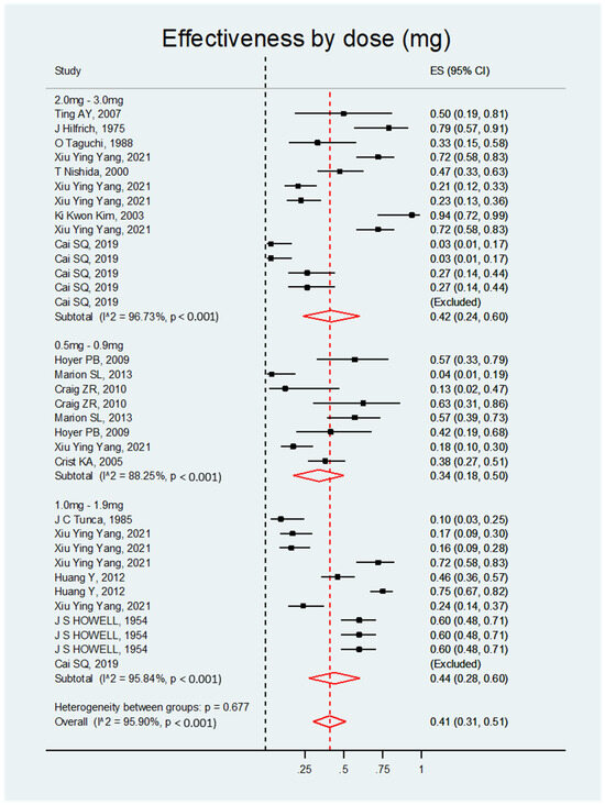 The studies were grouped into three categories of DMBA doses: 0.5–0.9, 1–1.9, and 2–3 mg/kg. All doses had a significant ES, indicating that DMBA is a significantly effective inducer of ovarian cancer regardless of the dose used (see Figure 3 and Table 2).
