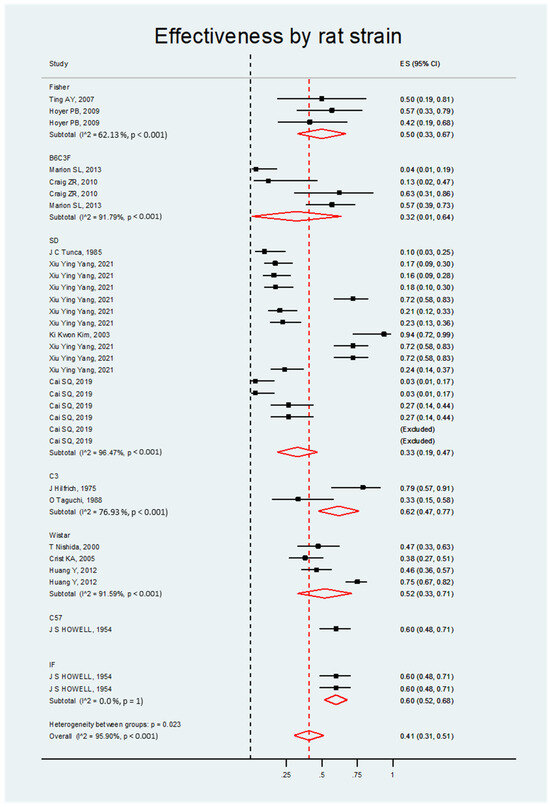 The meta-analysis of the studies found that DMBA was significantly effective in inducing ovarian cancer independent of the rat strain. Most strains had a positive ES that was statistically significant. Such was the case with Fisher, Sprague Dawley, and Wistar rates with B6c3 and C57, which are, therefore, strains that can be used in animal model experiments for studying ovarian carcinogenesis (see Figure 5 and Table 4).