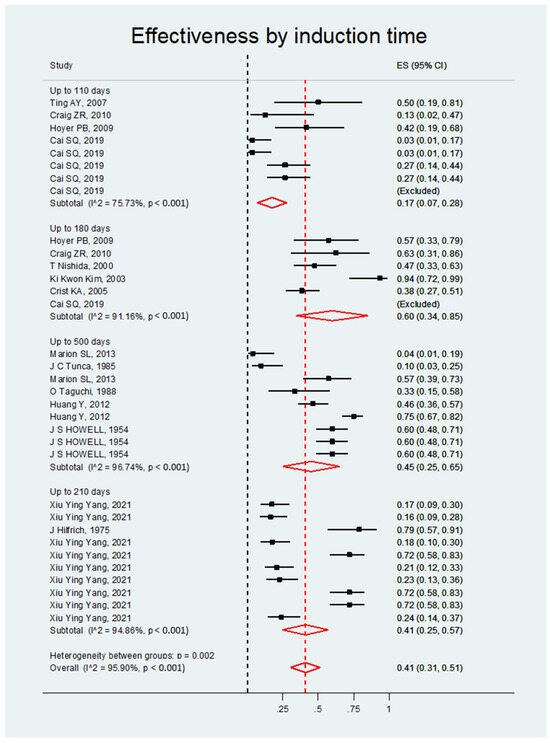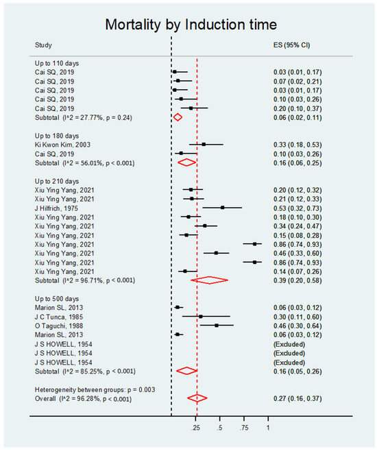 The mortality rate was significant regardless of the induction time. Overall, the effect size was 0.27; 95% CI, 0.16–0.37; p < 0.001 (see Figure 10 and Table 9).