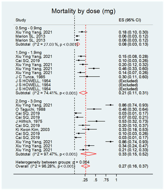 The mortality rate was significant regardless of the treatment dosage. Overall, the effect size was 0.27; 95% CI, 0.16–0.37; p < 0.001 (see Figure 7 and Table 6).