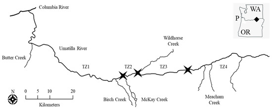 Thermal zones of the Umatilla River (Oregon, USA) used in this study. For the purpose of this study, the river was partitioned into four thermal zones. Thermal Zone 1 (TZ1) was characterized by relatively constant, maximum temperatures near 28.0 °C. Thermal Zone 2 (TZ2) was characterized by relatively constant, maximum temperatures >30.0 °C. Thermal Zone 3 (TZ3) was characterized by maximum temperatures that decreased from approximately 31.0 °C at the downstream end to 27.7 °C at the upstream end. Thermal Zone 4 (TZ4) was characterized by maximum temperatures that decreased from approximately 27.7 °C at the downstream end to <19.9 °C at the upstream end, a distance of approximately 30 river kilometers. The downstream boundary of TZ1 occurs at the confluence with the Columbia River. Due to the hydrogeomorphological characteristics of the watershed, the boundaries (black stars) between TZ1 and TZ2, TZ2 and TZ3, and TZ3 and TZ4 occur at uneven intervals throughout the river. The insert shows the Umatilla River confluence with the Columbia River (black diamond), which then flows downstream approximately 470 river kilometers to the Pacific Ocean (P), bisecting the states of Washington (WA) and Oregon (OR).