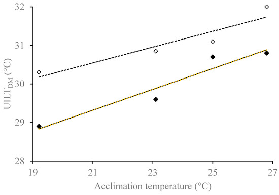 The relationship between acclimation temperature and the upper incipient lethal daily maximum temperature (UILTDM). The UILTDM was calculated using both a time to death (TTD, black diamonds) and percent mortality (PM, white diamonds) approach. The TTD analysis (solid line) exhibited a positive, linear relationship with acclimation temperature (slope = 0.270, R2 = 0.93, p = 0.038). The PM analysis (dashed line) also exhibited a positive, linear relationship with acclimation temperature (slope = 0.204, R2 = 0.89, p = 0.056). The slopes resulting from the TTD (0.270) and PM (0.204) analyses were similar, exhibiting overlapping 95% confidence intervals. A plateau in the relationship was not evident and the ultimate upper incipient lethal daily maximum temperature could not be determined.