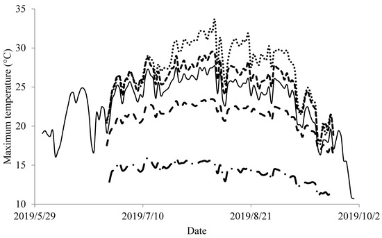 Daily temperatures during the study period in 2019. Actual maximum daily temperatures were recorded at the most downstream (stippled gray line) and most upstream (thick dashed gray line) reach of Thermal Zone 2 (TZ2). Actual maximum daily temperatures were also recorded at the most downstream reach (thin dashed gray line) and most upstream reach (dashed, stippled gray line) of Thermal Zone 4 (TZ4). In addition, monitoring efforts not directly related to this study recorded actual maximum temperatures (solid black line) at a gauge (PDTO) near Pendleton, Oregon (USA). Regression analyses indicated that the temperatures recorded at PDTO exhibited a significant, linear relationship to the most upstream reach in TZ2 (R2 = 0.989, p < 0.001) and the most downstream reach in TZ4 (R2 = 0.949, p < 0.001).