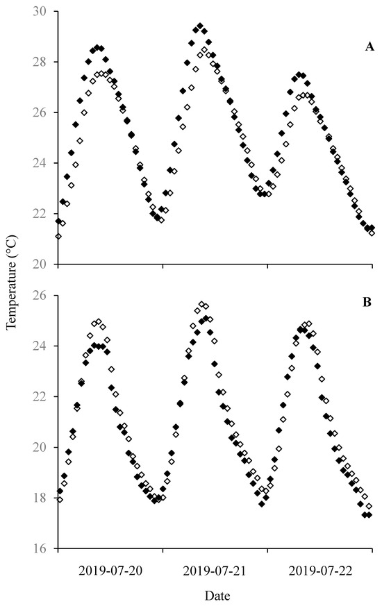 A comparison of diel temperature cycles in the Umatilla River, above (black diamonds) and below (white diamonds) the substrate surface. The upper panel (A) represents the most downstream reach in Thermal Zone 2 (TZ2) and the lower panel (B) represents the most downstream reach in Thermal Zone 4 (TZ4). Loggers, held in opaque tubing and either placed in the water column on the surface of the substrate or buried 4–7 cm below the substrate surface at the same location, recorded temperatures for the duration of the study. For the 2019 study period, when compared to those in the water column, maximum temperatures below the substrate surface were significantly cooler in TZ2 (mean = −0.51 °C, 95% confidence interval = 0.10) and similar in TZ4 (mean = −0.13 °C, 95% confidence interval = 0.16).
