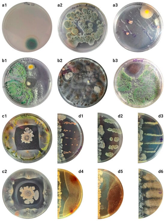 (a1–a3) Cultures of initial flushes from different sources. Photographs were taken 5 days after seeding. More detailed descriptions and cultures are shown in S1–S2. (a1) Cultures on solid Chapek’s medium without enrichment of cultures from a container in which the bee was kept for 1 h. Mean CFU: 8.8 ± 4.6. (a2) Cultures of total flushes from the surfaces of bees without enrichment on solid Czapek’s medium. Mean CFU: 130.2 ± 16.8. (a3) Cultures after enrichment on liquid medium for 24 h. Seeding by thinning stroke. (b1–b3) Examples of occurrence of suppression zones in initial cultures seed after enrichment. (b1,b2) Growth suppression by S10b culture. (b3) Growth suppression by S13a culture. (c1,c2,d1–d6) Tests for antibiotic production by S10b culture. More tests are presented in S14–15. (c) Spot test. (c1) Suppression of culture S13a. (c2) Suppression of culture S5c (photo at bottom). A “gallo” of unknown nature is visible, unique to the interaction of these two cultures. (d1–d6) Tests after seeding with lines. (d1) Interaction with S10c culture. Suppression zone: 0.38 ± 0.07 cm. (d2) Interaction with S5e culture. Suppression zone: 0.84 ± 0.14 cm. (d3) Interaction with S5b culture. Suppression zone: 0.28 ± 0.03 cm. (d4) Interaction with culture S5c. Suppression zone: 0.77 ± 0.03 cm. (d5) Interaction with culture S5f. Suppression zone: 0.84 ± 0.04 cm. (d6) Interaction with culture S10f. No suppression zone is detected.
