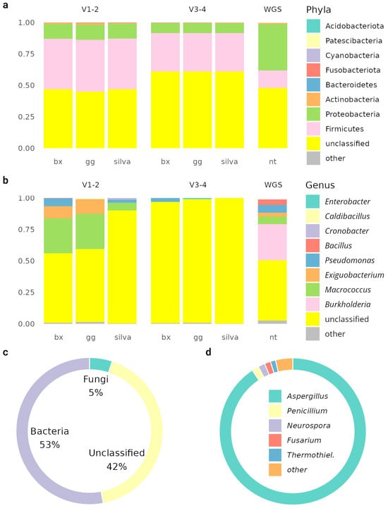 Results of metagenomic annotations. Classification results of bacterial reads at phylogroup (a) and genus (b) levels. For 16S sequencing data annotation, unweighted classifier training on SILVA, BeeXact (bx), and GreenGenes (gg) databases were used with combined samples with pan-metagenomic data. (c) Composition of sample using WGS metagenomics. (d) Composition of fungi at the genus level according to the results of WGS annotation.
