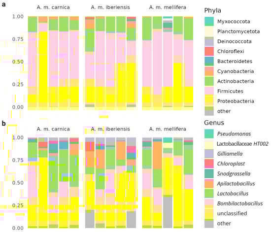 - Engel, P.; Martinson, V.G.; Moran, N.A. Functional Diversity within the Simple Gut Microbiota of the Honey Bee. Proc. Natl. Acad. Sci. USA 2012, 109, 11002–11007. [Google Scholar] [CrossRef] [PubMed]