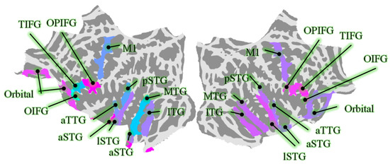 The selected ROIs, including middle temporal gyrus (MTG), precentral gyrus (M1), anterior transverse temporal gyrus (aSTG), orbital part of the inferior frontal gyrus (OIFG), opercular part of the inferior frontal gyrus (OPIFG), triangular part of the inferior frontal gyrus (TIFG), orbital gyri (Orbital), lateral aspect of the STG (lSTG), anterior of the STG (aSTG), posterior of the STG (pSTG), and inferior temporal gyrus (IFG).