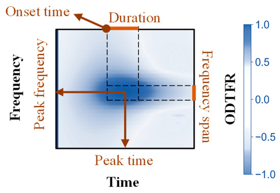Time–frequency features for oscillatory differences in the ODTFRs were parameterized according to the definition of local events [48,49]. Firstly, multiple local peaks of ODTFRs were detected with the ‘scipy.ndimage’ library in Python. The frequencies and times corresponding to the extrema of these local peaks were designated as peak frequencies and peak times, respectively (see Figure 2).