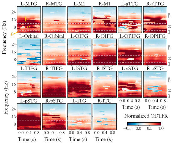 Firstly, we utilized the SLT-CDT to calculate the time–frequency differences between neural activities during processing congruent and incongruent semantics within ROIs, as shown in Figure 3. Figure 3 shows the ODTFR of all ROIs, which were averaged across participants. Significant differences were apparent in the low-frequency, alpha, and low-beta bands (13–20 Hz) of the time–frequency spectrums across multiple cortical regions. Specifically, the low-frequency (<4 Hz) oscillations in L-MTG, R-MTG, L-M1, L-Orbital, and L-lSTG, predominantly occurred after 400 ms. The differences in low-frequency (<4 Hz) oscillations in the ITG were less pronounced compared to those in other ROIs. In other ROIs, distinct differences in neural oscillations occurred across the whole semantic-processing period. Significant differences in alpha-band oscillations were observed in L-MTG, L-M1, R-M1, aTTG, L-OIFG, R-OIFG, L-OPIFG, R-TIFG, L-lSTG, L-pSTG, and R-pSTG. Specifically, the oscillatory activities associated with semantic incongruence were notably stronger than those associated with semantic congruence. However, in L-Orbital, the oscillatory activities of semantically congruent situations were significantly stronger than those of semantically incongruent ones. As for the beta-band oscillations, strong differences were found in L-MTG, R-MTG (400–600 ms), R-M1, L-aTTG, R-aTTG, R-OIFG, L-OPIFG, L-lSTG, L-aSTG, L-pSTG, and R-pSTG. Slight differences in oscillatory activities also occurred in other brain regions. These results underscore the efficacy of OPM-MEG in capturing neural oscillations during the processing of Chinese semantics.