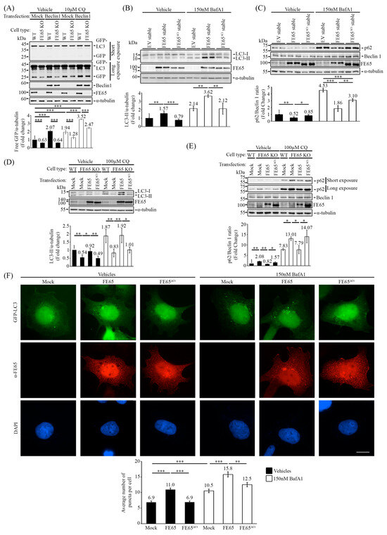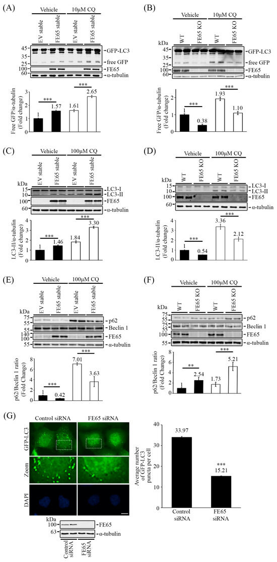 In Figure 1A,B, we observed that overexpression of FE65 in cells led to an increase in the release of free GFP from GFP-LC3, whereas knockout of FE65 resulted in a decrease in free GFP release, indicating a positive role for FE65 in autophagy. Additionally, treatment with CQ, which inhibits autophagosome acidification, led to the accumulation of free GFP. In the presence of CQ, a similar phenomenon regarding the release of free GFP is observed in Figure 1A,B, suggesting that FE65-mediated GFP-LC3 cleavage occurs at an early stage of autophagy.