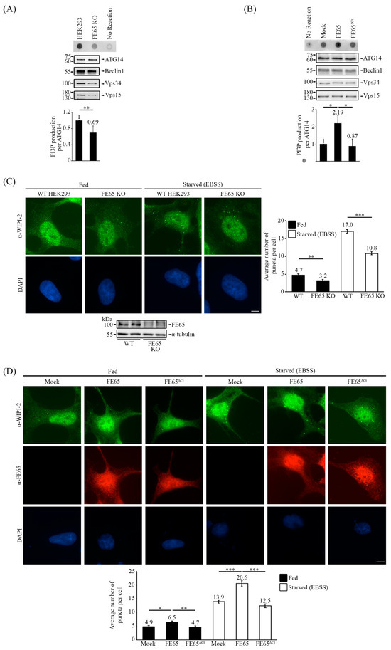WIPI (WD-repeat PI3P effector protein)-2 is a PI3P effector that is recruited when autophagy is induced [38,42,50]. In order to validate whether FE65 upregulates PI3KC3 complex I activity in cellulo, we analyzed the number of WIPI-2 puncta in cells. As shown in Figure 4C (please also see the puncta count in Supplementary Figure S4 and immunofluorescence images in Figure S8B), the count of WIPI-2 puncta was significantly higher in WT HEK293 cells compared to FE65 KO cells, both with and without EBSS-induced starvation treatment. On the other hand, FE65 stimulated WIPI-2 puncta formation. However, such stimulatory effect was absent in FE65ΔCt overexpressing cells (Figure 4D, Figures S5 and S8C).